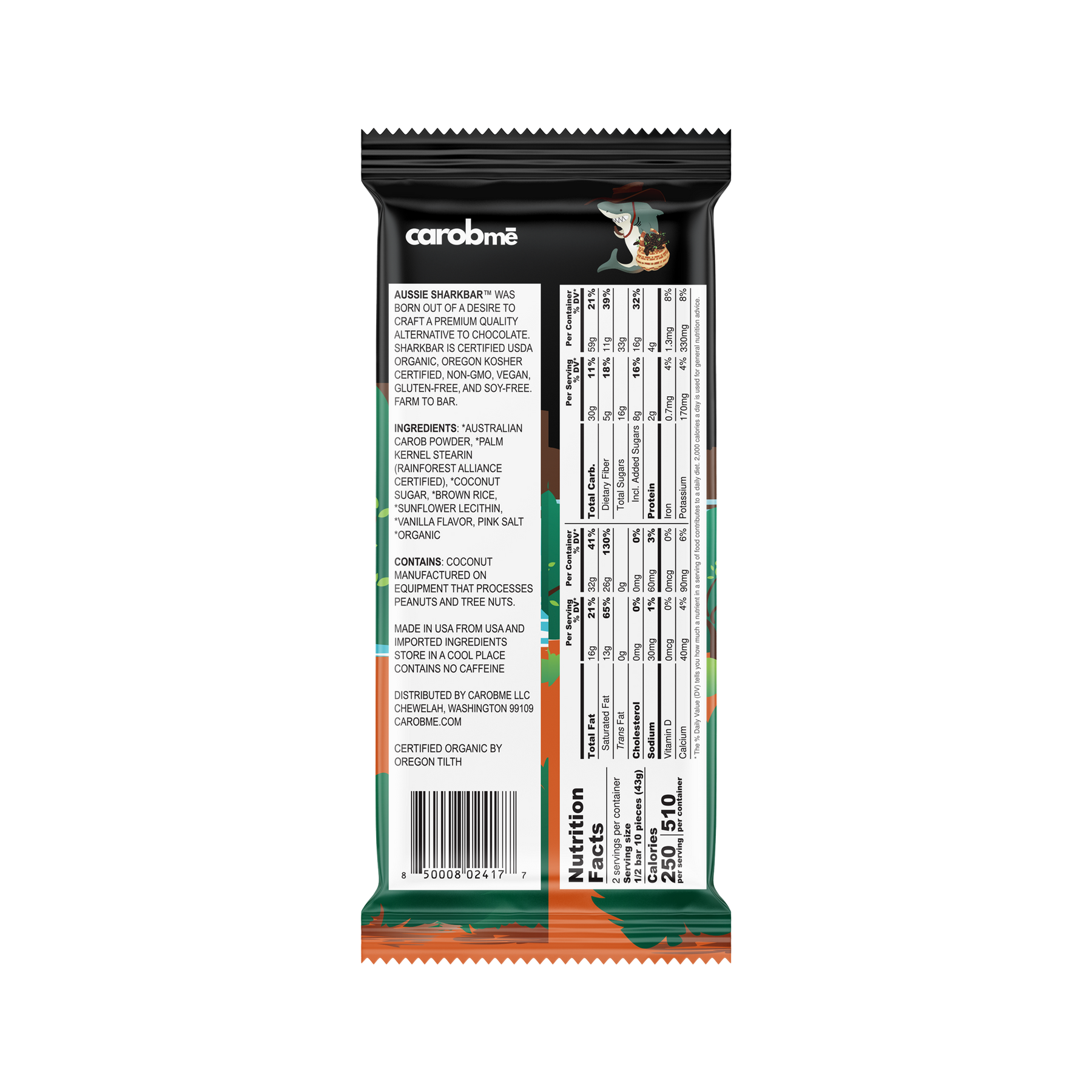 Crispy brown rice crispies enrobed in creamy carob. Bite like a shark! Obsessively curated vegan carob crafted for sweet cravings. SharkBar Koala Krunch is a healthy alternative to chocolate.  Certified Organic by Oregon Tilth. Vegan. Oregon Kosher Certified. Soy-free. Gluten-free. Caffeine-free. Unwrap a world of indulgence with organic carob – The ultimate chocolate alternative.